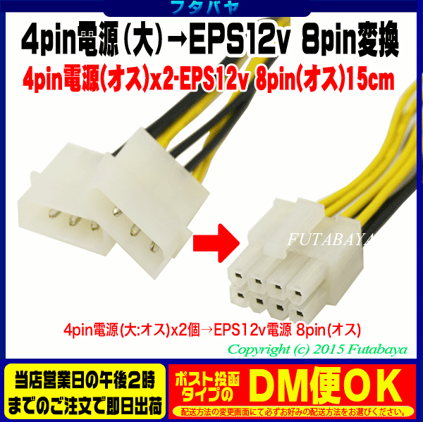 4pin電源(大)→マザーボード電源EPS12v 8pin変換ケーブルアイネックス(AINEX) PX-009A●4pin電源(大:オス)x2個→EPS12v 8pin(オス)●ケーブル長:15cm●4pin電源コネクタ(大)側x2個使用