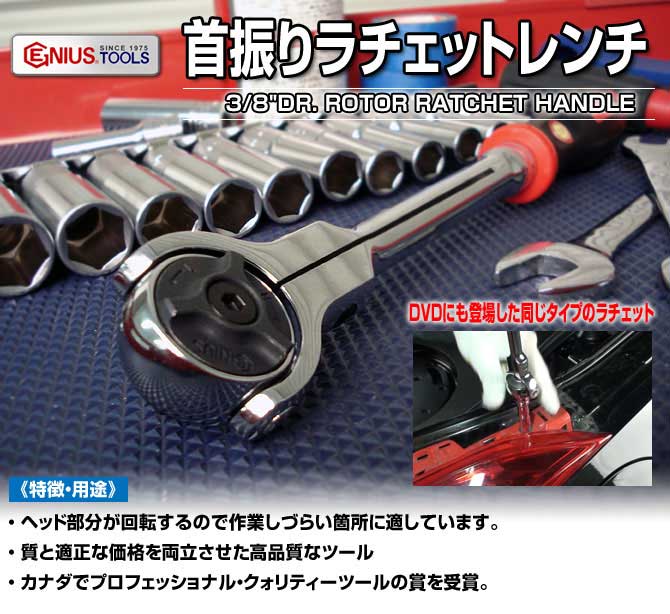 首振りラチェットレンチ 3/8”DR. 【DVDに登場した同じタイプ!!】【GENIUS】首振のパーツエアロ取り付けに!