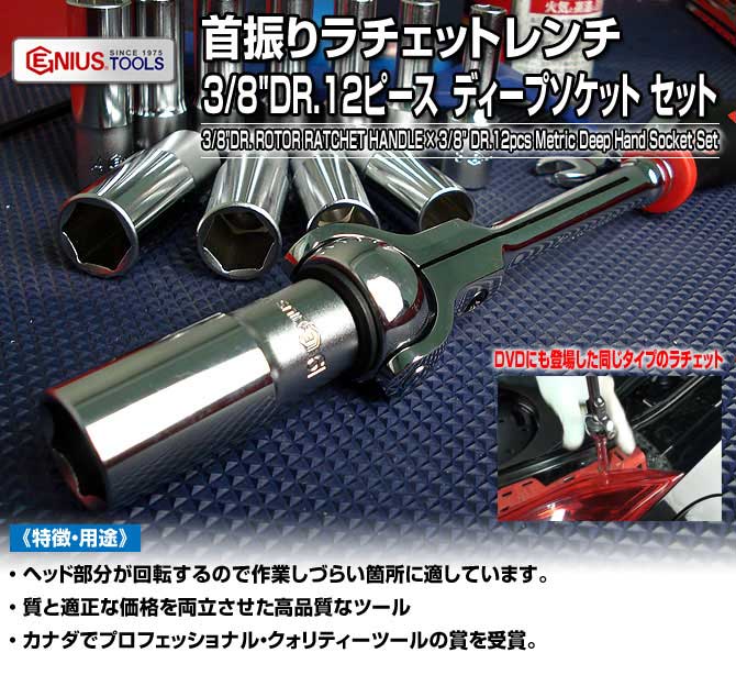 首振りラチェットハンドル+3/8”DR. 12ピース ディープソケットセット 3/8”DR. 【DVDに登場した同じタイプ!!】【GENIUS】首振のパーツエアロ取り付けに!