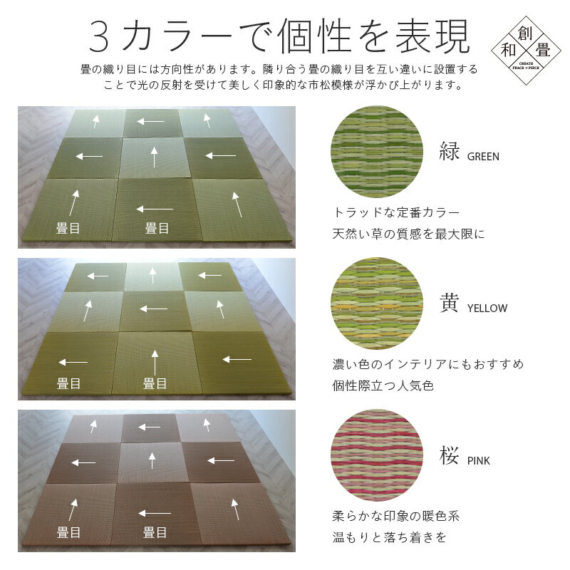 商品名 フローリング畳 パラレル[PARALLEL] 3枚セットカラー畳/い草畳表/縁なし畳 サイズ 約82cm×82cm×厚さ2.5cm/枚 カラー 3色(グリーン・イエロー・ピンク) 重 量 約2.85kg/枚 生産国 日本製(自社製造) 素 材 畳 表:カラーい草(選べるカラー3色) 芯 材:インシュレーションボード+ポリスチレンフォーム 裏 面:滑りにくい加工(不織布/ロの字貼り) 特 徴 い草は高温多湿の日本風土によくあった自然素材のひとつです。