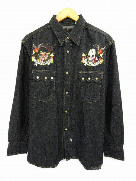 Skull Jeans スカルジーンズ デニムシャツ 長袖 ドクロ スカル デザイン刺繍 ブラック LL □ メンズ 【中古】【ベクトル 古着】 180911 ブランド古着ベクトルプレミアム店